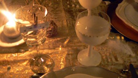 J'ai donc peint des verres en blanc + 2 soliflores que j'ai décoré de roses argentées. Des petites cagettes (à pommes de terre) peintes et ornées de noeuds m'ont servies à présenter le pain. Quant au reste, des plumes, des cailloux dorés, des bougies blanches, or et argent.