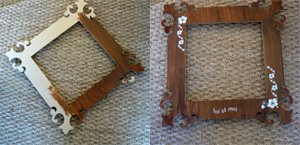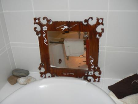 Un miroir à décorer acheté dans une boutique de loisirs créatifs "11 Euros", des transferts blancs "4.50 euros", peinture acrylique couleur chocolat, blanc + vernis acrylique.