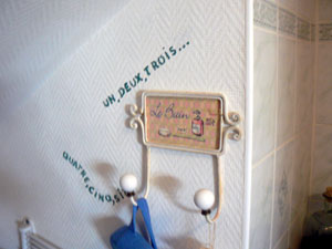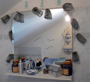 Une cuvette et un broc en fer trouvé en foire à tout et décoré avec du collage de serviette dans les tons de ma salle de bains + quelques coquillages qui nous rappellent la mer.