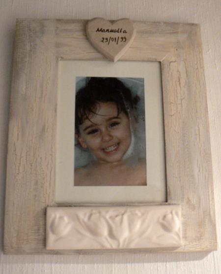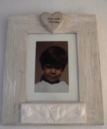 2 cadres achetés en solderie. J'ai obtenu cette effet vieilli avec un vernis craquelé. 2 petits coeurs en bois ou j'ai noté leurs prénoms et dates de naissance.