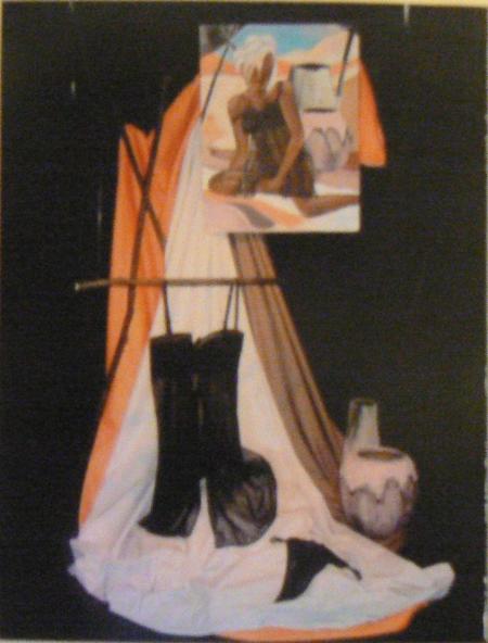 A l'origine sur le tableau original du peintre (voir photo de droite) la femme est nue. J'ai reproduis ce tableau , seulement elle est maintenant vêtue des sous-vêtements que je présente en vitrine (photos de gauche).